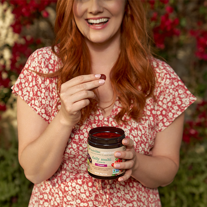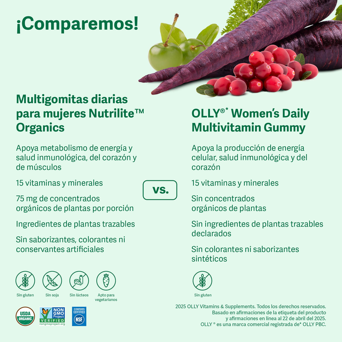 Nunca ha sido tan fácil como ahora obtener los nutrientes de plantas que necesitas a diario. Con las Multigomitas diarias para mujeres Nutrilite™ Organics, obtienes 15 vitaminas y minerales esenciales y 75 mg de nutrientes orgánicos de plantas para ayudar a apoyar tu inmunidad, energía, y salud de los ojos y huesos.†Además, nuestras gomitas contienen arándanos rojos, acerolas y zanahorias moradas cultivadas en nuestras propias granjas orgánicas con certificación USDA y en granjas asociadas.